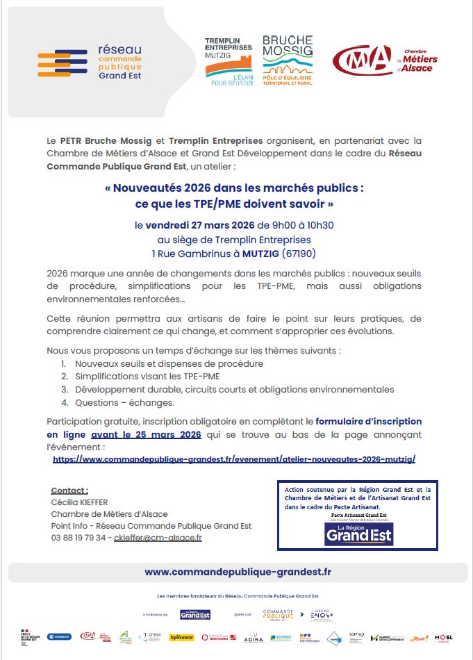 Atelier marchés publics avec le Réseau Commande publique Grand Est et la Chambre de métiers d’Alsace vendredi 27 mars de 9h à 10h30.